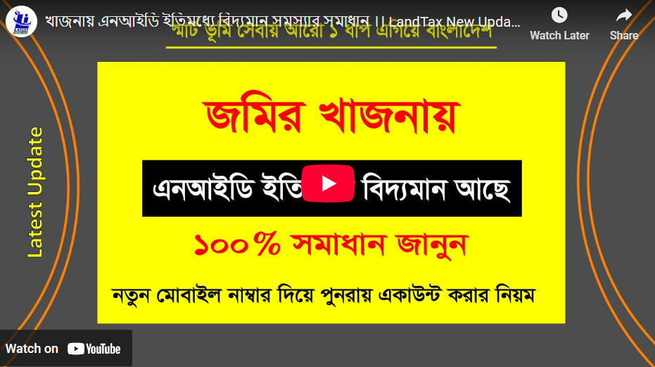 জমির খাজনার একাউন্টের মোবাইল নাম্বার পরিবর্তন করতে চাইলে এই ভিডিওটি আপনার জন্য খুবই গুরুত্বপূর্ণ। অথবা যদি এমন মেসেজ পান এনআইডি ইতিমধ্যে বিদ্যমান আছে এই মেসেজটি পেলে আপনি মোবাইল নাম্বারটি কিভাবে পরিবর্তন করে নতুন একাউন্ট তৈরি করবেন সেই বিষয়টিও জানতে পারবেন এই ভিডিওটির মাধ্যমে। তাই গুরুত্বপূর্ণ এই ভিডিওটি না টেনে সম্পূর্ণ দেখুন এবং এই ধরনের গুরুত্বপূর্ণ ভিডিও প্রতিনিয়ত পেতে অবশ্যই লেটেস্ট ইনফো বিডি YouTube চ্যানেলটি সাবস্ক্রাইব করে পাশে থাকা বেল বাটন অন করে রাখুন। এতে করে পরবর্তী গুরুত্বপূর্ণ ভিডিও পাবলিশ হওয়া মাত্র আপনার মোবাইলে নোটিফিকেশন চলে আসবে। ভিডিও তালিকায় ভিজিট করলে বুঝতে পারবেন আমি আপনাদের জন্য কতটা গুরুত্বপূর্ণ ভিডিও প্রতিনিয়ত পাবলিশ করে থাকি। আমি যেই কাজ করে অর্থ উপার্জন করি সেই কাজের ভিডিও তৈরি করে আপনাদেরকে শেয়ার করি। এতে করে আপনারা নিজের কাজে প্লাস গ্রাহক সেবা দিয়ে আয়ের কাজেও ব্যবহার করতে পারবেন।