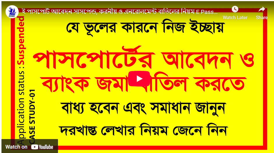 ই পাসপোর্টের জন্য আবেদন জমা দিয়েছেন, ফিঙ্গার করেছেন, ডেলিভারি স্লিপ পেয়েছেন, পাসপোর্ট পাওয়ার জন্য অপেক্ষা করতেছেন। কিন্তু এক সময় জানতে পারলেন আপনার আবেদনটি সাসপেন্ড হয়ে গেছে। অনলাইনে স্ট্যাটাস চেক করে দেখলেন আপনার আবেদনটি সাসপেন্ডেন্ট অবস্থায় আছে। এমনটা ঘটে থাকলে এই ভিডিওটি আপনার জন্য খুবই গুরুত্বপূর্ণ। কারণ আজকের এই ভিডিওটির মাধ্যমে একটি সাসপেন্ড হওয়া ফাইলের কি ঘটনা ঘটেছে, কিভাবে তিনি সমাধান করছেন ইত্যাদি বিষয় নিয়ে আমি আপনাদেরকে শেয়ার করব।